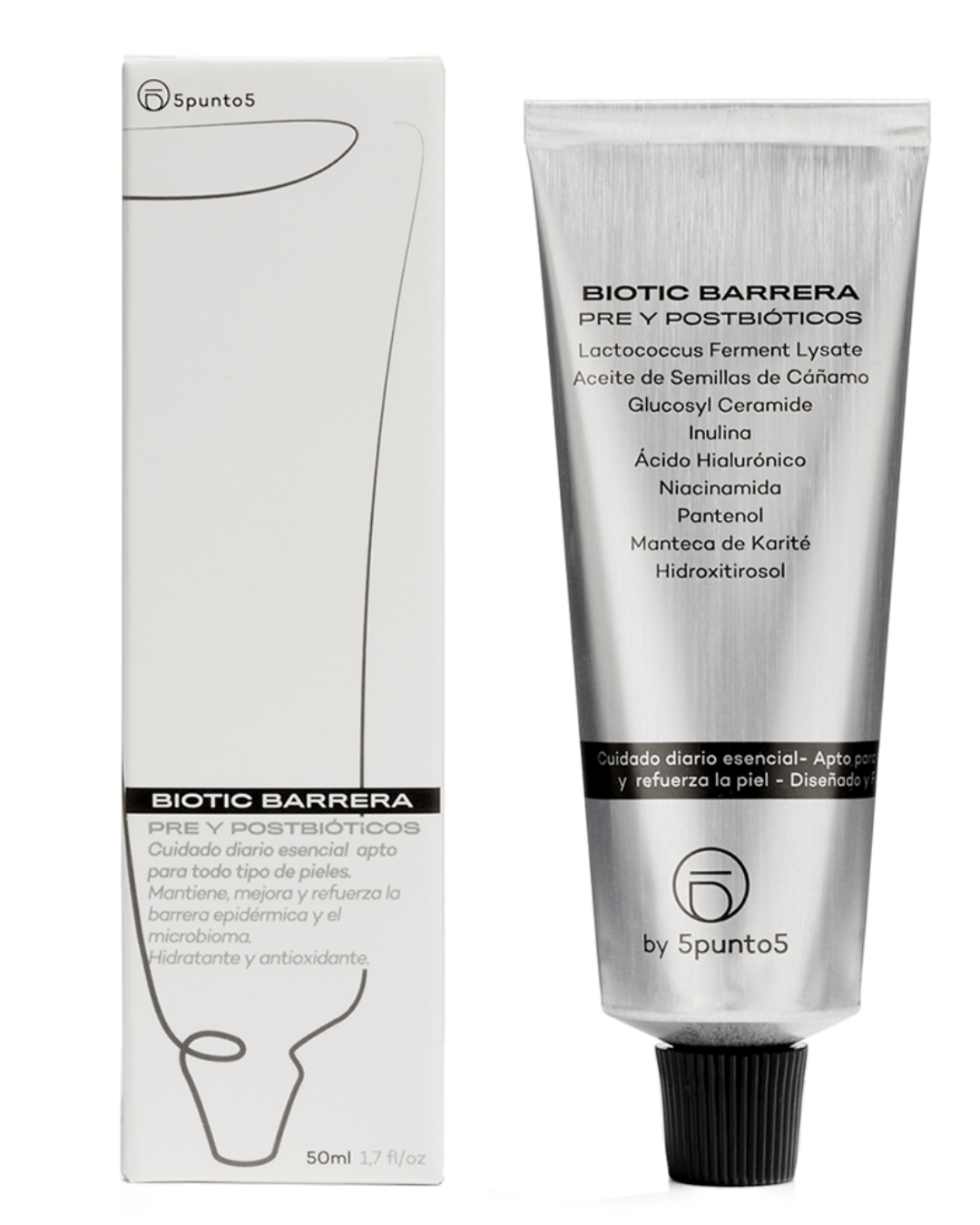 La crema Biotic Barrera de 5punto5 es el cuidado imprescindible en cualquier rutina de cuidado de la piel. Con su textura ligera y apta para todo tipo de pieles, ayuda a mantener, mejorar y reforzar la barrera cutánea y el microbioma. Además, aporta hidratación, reparación y poder antiOX para conseguir una piel cuidada, sana y bonita.