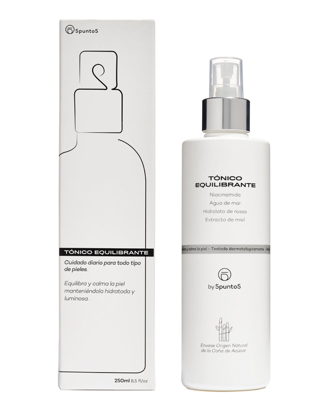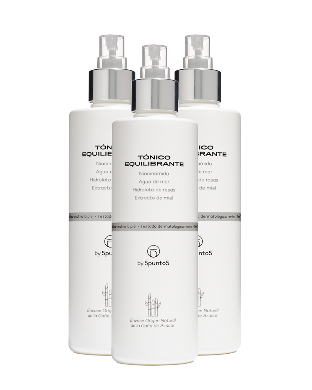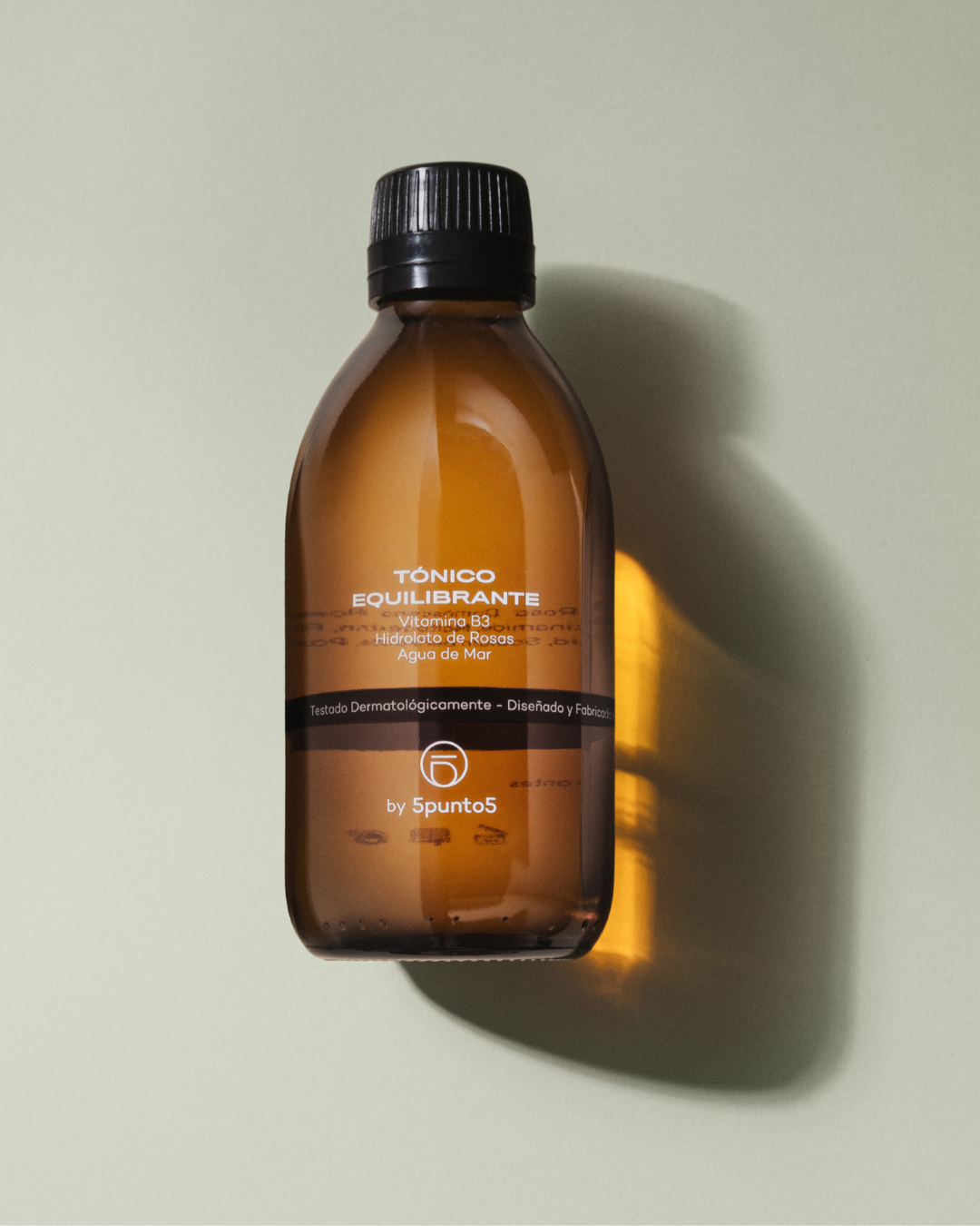 El Tónico Equilibrante 5punto5, procedente de agricultura ecológica, cuenta con una alta concentración de activos, donde el 99,3% del total de ingredientes de la fórmula es de origen natural. Su cuidada formulación con destilados florales de rosas y agua marina junto a agentes hidratantes y vitaminas hidrosolubles, regula y equilibra la actividad de la piel.